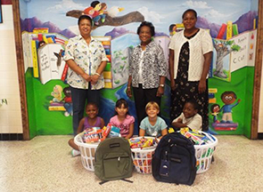 School supplies are delivered in September and also in January if needed. Outreach Committee members shown are Barbara Crews (left), Ann Henderson (middle) Felecia Mason (right).